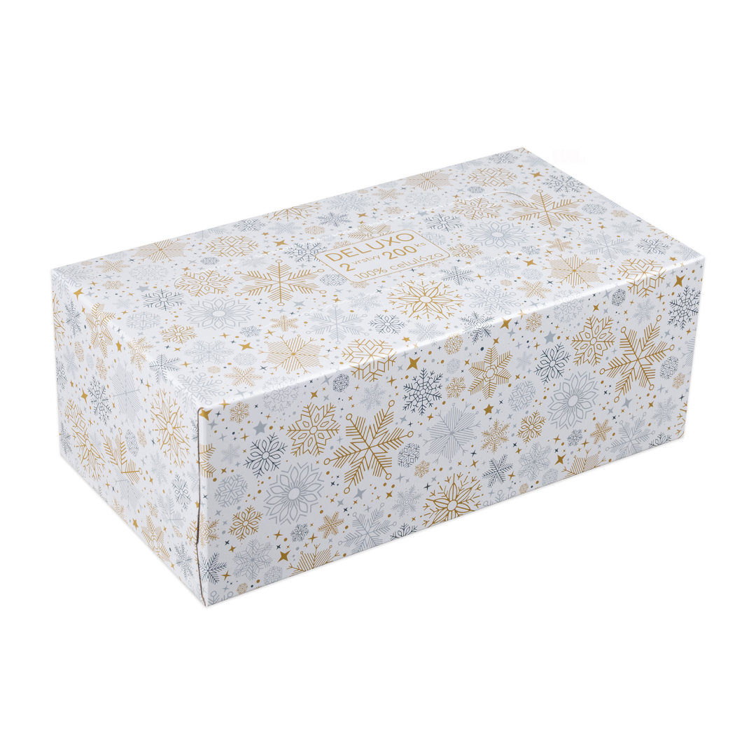 Dvouvrstvé kapesníčky Deluxo jsou jemné, měkké a zároveň pevné, vhodné pro každodenní použití, vyrobeny ze 100% celulózy, rozměry kapesníčku 200 x 190 mm, praktická krabička s motivem vloček.
